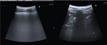 在我们的研究中,并证明是一种高效,安全,可行的方法。高诊断准确性促进了急性消化患者肺部肺病的诊断。最后,胸部美国很容易重复,让患者在重症监护室内每天密切监测几次。实时超声图像快速发展,超声波可用于监测患者随访期间的治疗响应。用基因型肺水肿纳入本研究的患者用利尿疗法治疗,并在几个小时后经历了第二次超声检查。表现出B线的减少。抗凝血剂和肺挫伤中毒病例中的超声检查显示出在逆后几天的时间进化,随着与空气支气管图相关的肺结核的变化(图5)。