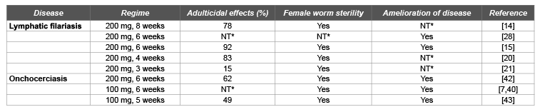 Hoerauf等人[7,40]在加纳的一些试点、开放标记试验中证明,口服强力霉素100 mg/天的6周疗程可使血糖降低90%以上沃尔巴克氏体属随后皮肤微丝蚴几乎完全和持续消失(12-18个月)。通过对切除结节的组织学评估,他们观察到强力霉素对胚胎发生的有害影响,尽管18个月后,强力霉素对盘尾丝虫病患者的杀灭作用尚不明确[7,40]。