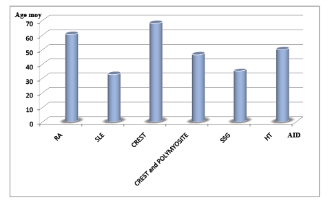 根据自身免疫性疾病的比较不同年龄比较,SLE和SSG分别为32.5岁和35年的年轻女性更频繁(KHI 2 = 5.30)。旧女性更有可能具有嵴(68岁),RA(60.4岁),HT(50岁)和嵴和聚肌炎(46.5岁)(KHI 2 = 3.72)。