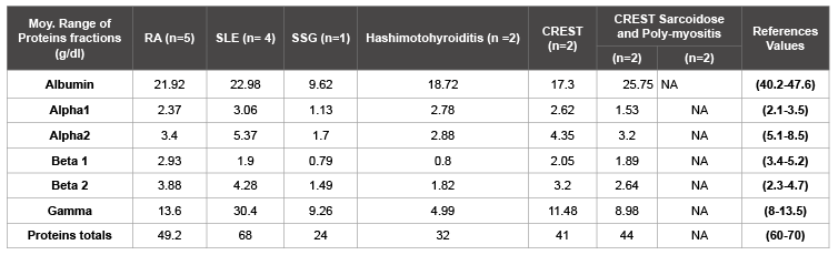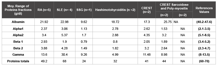 表2显示了研究队列中自身免疫性疾病患者血清中的炎症蛋白谱。分析蛋白质的不同部分,发现低白蛋白血症与自身免疫疾病有关(p=0.02)。因此高γ球蛋白血症与SLE有关,低γ球蛋白血症与桥本甲状腺炎有关。