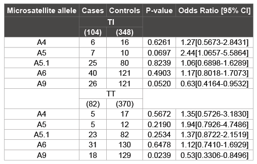 与对照组(TN)相比,TI组(OR=0.63 95% CI: 0.4164-0.9532, p= 0.0520)和TT组(OR=0.53 95% CI: 0.3306-0.8496, p=0.0239)中MICA-A9等位基因具有统计学意义(表1)。