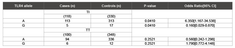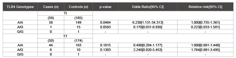 炎症性沙眼患者的TLR4 A等位基因频率明显较高(OR=6.350, 95% CI: 1.167-34.538, p=0.0410),而对照组的TLR G等位基因频率较高(OR=0.160, 95% CI: 0.029- 0.870, p=0.0410;TT患者与健康对照组之间的等位基因和基因型频率无显著差异,而TI组病例中TLR4 A/A显著较高,对照组杂合度较高(表4)。