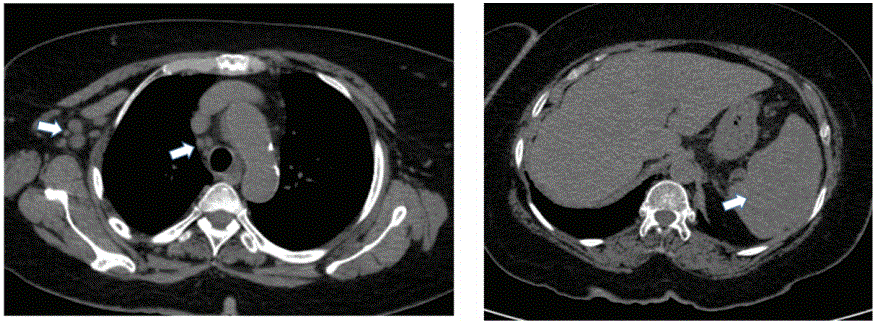 图2:纵隔窗显示轻度纵隔和右侧腋窝淋巴结病变。也有轻微的脾肿大。