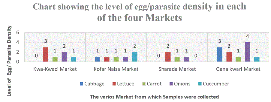 总共(25)个样品,(5)每个(卷心菜)芸苔属植物oleracea”,生菜”摘要以”,胡萝卜”胡萝卜胡萝卜”,洋葱”Alium cepa“和黄瓜”Cucumis巨大成功)收集自四个市场(Kwa-Kwaci市场、KofarNa’isa市场、Sharada市场和GanaKwari市场),这些市场都位于卡诺大都会。对观察到的每种蔬菜样本记录了“许多(100%)、中等(75%)、很少(50%)、稀少(25%)和无(0%)”等不同级别的污染。这种污染是由于卵和囊肿的存在蛔虫,滴虫种,肠鞭毛虫和痢疾的物种.这些结果见表1、表2和表1。在这四个市场中,“加纳卡威市场的虫卵/囊肿数量最高,所有样本中都有污染物。随后是夸夸奇市场,四个样本中有卵子/囊肿,然后是科法纳伊萨市场,所有样本都受到污染。Sharada市场的污染物含量最低,只有三个样本含有卵/囊肿。在收集的所有蔬菜样本中,洋葱的污染程度最高,其次是卷心菜和生菜,其次是黄瓜,最后是胡萝卜。