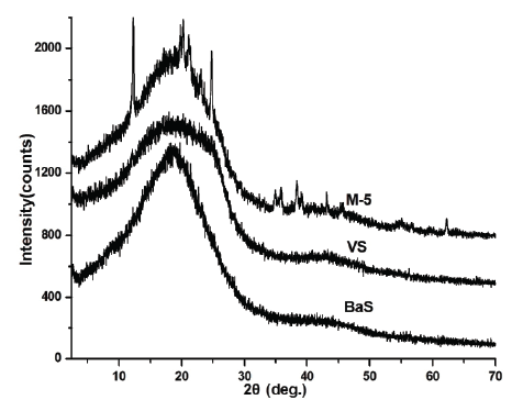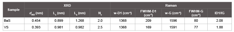 计算了BaS和VS的XRD参数,如表2所示。层间间距(d002)为0.454 nm,镜质体为0.393 nm。它表示d的值002钡晶石比镜质体大,但均大于完全有序石墨。一般来说,d的值002对于完全有序的石墨结构而言,其孔径在0.336到0.344 nm之间。随着含碳量的增加,煤的结晶粒度变得致密,相应的层间间距(d002)减少[3]。由表1可知,BaS和VS的含碳量分别为81.59%和85.84%,比石墨的含碳量要少。因此,维002BaS和VS值均大于纯石墨。晶粒的平均堆积高度(Lc),则为0.899 nm,镜质组为0.981 nm。