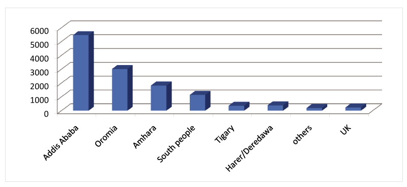 根据这项研究,大多数患者表示他们来自亚的斯亚贝巴,其次是奥罗莫人、阿姆哈拉人、南方人和提格雷人。来自哈勒/德雷达瓦、本尚古尔和索马里地区国家的患者非常少,有患者名单没有注明那里的地址和级别为未知。根据本研究,就诊Tikur Anbessa放射治疗中心的患者数量与距离中心的距离成反比(图2)。