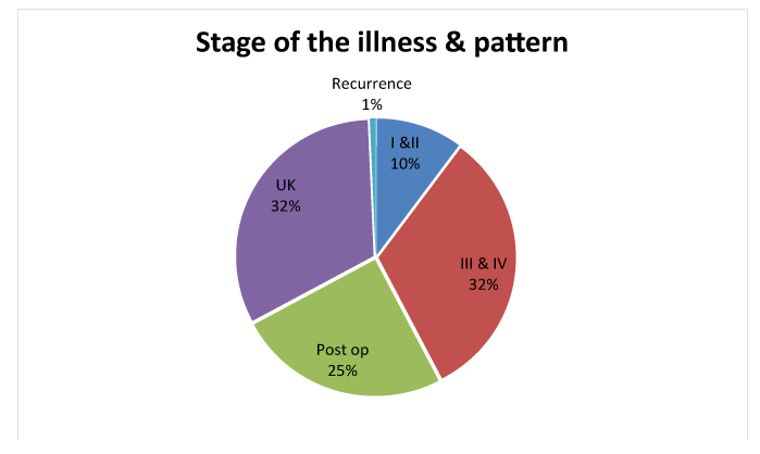 尽管延误诊断的原因超出了本研究的范围,但我们发现大部分患者来科时处于局部晚期或转移期。在登记簿上,术后患者大多登记为术后,没有明确的分期,难以进行分类。有一组患者(32%)发现有III期和IV期,几乎相同数量的患者来自不同类型的手术。如下图4所示,只有10%的患者在早期I期和II期来到该中心(图4)。