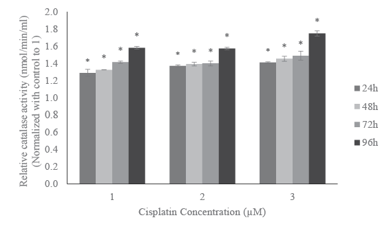图3:顺铂对HL-60细胞过氧化氢酶活性的影响。将HL-60细胞与1,2和3μm的顺铂一起温育24小时,48h,72h和96h。在每次处理之后,使用570nm的分光光度计估计过氧化氢酶活性。结果以Nmol / min / ml表示。数据与控制归一化为1.数据表示为三个独立实验±标准偏差的平均值。小于0.05的p值被认为是统计学意义。