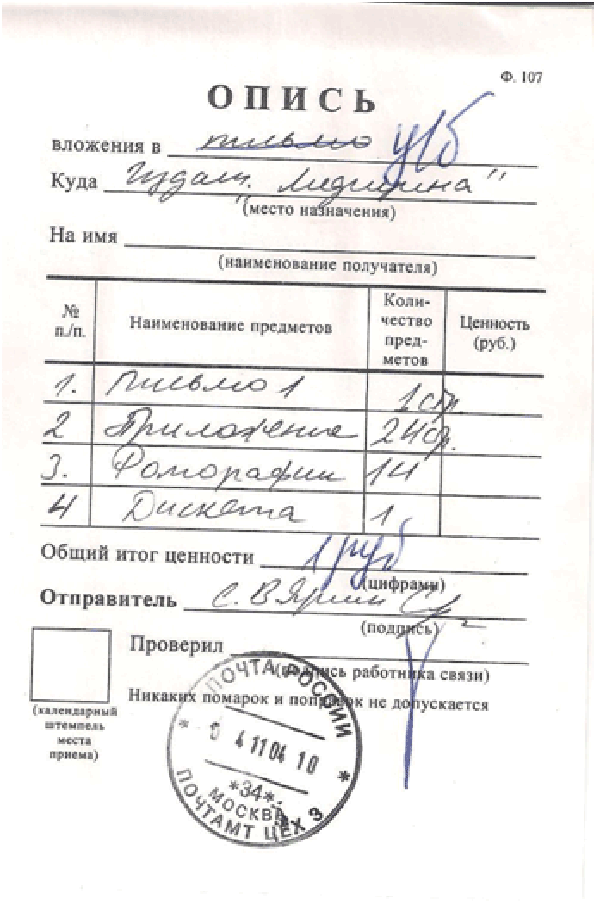 图6:04年11月4日的邮政收据(信件日期为03年11月4日),确认14张照片连同其他材料已寄往Meditisina出版社;这些照片尚未归还作者。