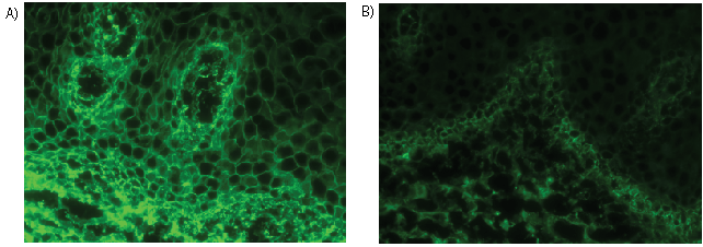 图1:大疱性类天疱疮的直接免疫荧光检测A)IgG的效价为1:200,B)C3G的效价为1:200