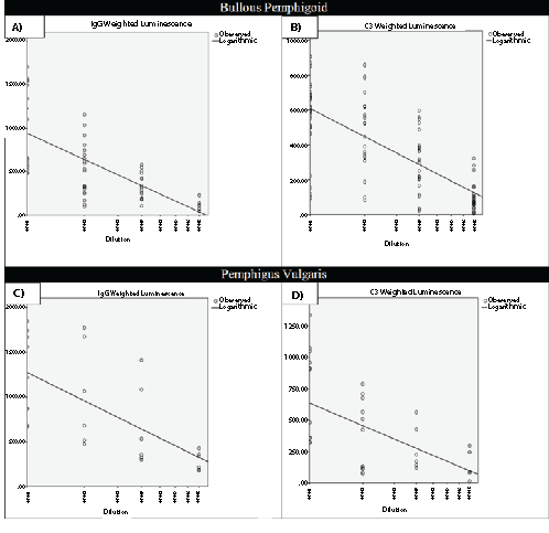 图3:对于大疱性类天疱疮(a,b)和寻常性天疱疮(c,d)患者的直接免疫荧光样本,显示加权发光*和对数回归线,水平轴对数变换。