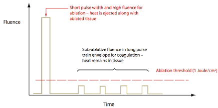 变量脉冲:下一步是发展可变脉冲Er:YAG激光技术,该技术允许医生改变脉冲持续时间,从而使从纯烧蚀(短脉冲持续时间)到更热(长脉冲持续时间)的脉冲都可以使用[11]。能量传递机制如图2所示。