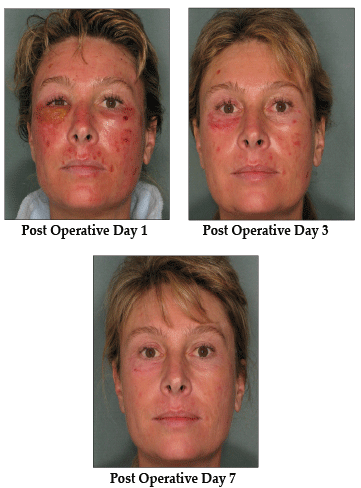 7名患者完成了这项研究。第8个是后续跟进。平均皱纹评分、治疗后水肿和红斑的消退时间、疼痛评分见表1。
