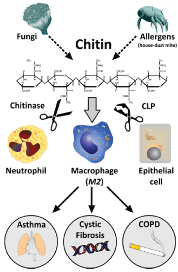 图7:几丁质、几丁质酶和几丁质酶样蛋白作为过敏/触发环境成分的作用。[35]。
