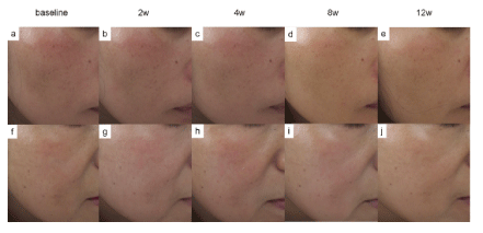 如图3所示,两位独立皮肤科医生评估的mMASI评分在整个研究过程中逐渐下降。开始治疗2周后,mMASI评分较基线值显著降低(P=0.044,非常接近临界值,差异有统计学意义(0.05)。在第4、8和12周,与基线值相比,mMASI评分显著降低,表明黄褐斑在整个治疗过程中逐渐改善(4周,P<0.01;8周,P < 0.001;12周,P < 0.001)。