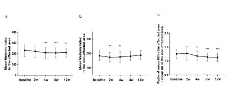 结果:22名患者完成了治疗。其中86.36%的患者治疗后色素沉着得到改善。与基线相比,12周时病灶MI及MI与正常皮肤的比值明显下降,正常皮肤MI无明显下降。