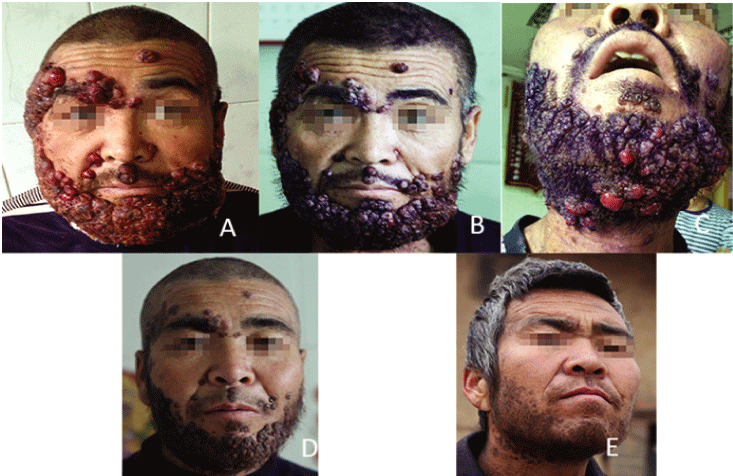 第四次就诊时间为2012年9月20日。患者脸上的病变已经塌陷;最后,患者留下了小口大小的病变。塌陷的病变变为深棕色(图1D)。我们建议患者继续服用之前的药物。