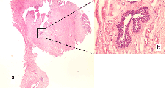 患者在全身麻醉下进行了病灶切除、刮除和拔牙36、37和38次。组织学诊断为单囊性成釉细胞瘤伴壁浸润(图2a和2b)。