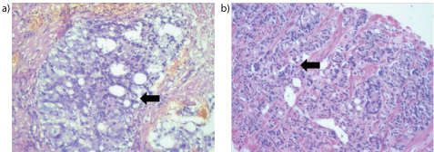 如果>95%形成/融合/筛状腺体或核心腺体缺失的病例,< 5%形成良好的腺体成分不包括在分级中。形成/融合/筛状腺体也可以是小成分的一部分。CGGS被报道为最终印象中提到的最高等级的单个岩芯。
