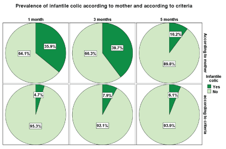 图1:1个月,3个月和5个月时出现婴儿绞痛的饼状图。