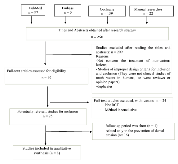 最后,剩下的25篇文章,其中17篇最终被排除,因为它是对人类牙釉质的原位研究,只与预防牙齿侵蚀有关,以及一项随访期短(不到1年)的随机临床试验。