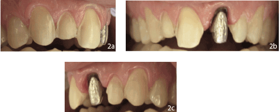 在移除9号牙的现有冠后,存在一个金属铸造桩和核,并有复发龋坏。龋齿是用圆形钻子挖出来的。临床判断是保持桩核完整,因为之前的根管治疗无症状,并将边缘改善至90度肩缘,延伸至牙龈下(图2b-c)。