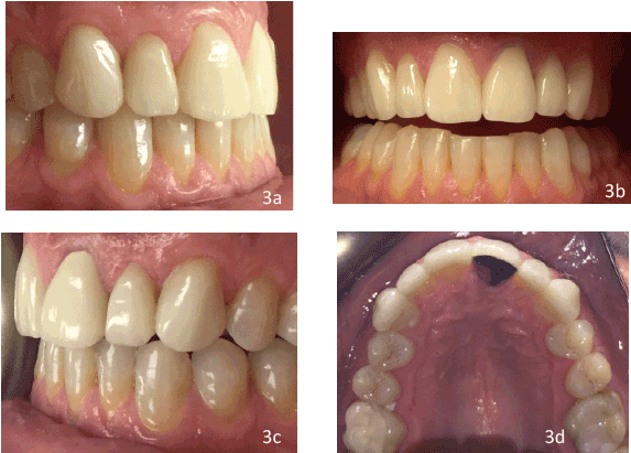 从实验室返回后,对模型进行了5个单板和1个冠的贴合度和颜色一致性检查。临时修复被拆除,牙齿被用浮石浆清洁以清除任何碎屑。永久性修复尝试和检查适当的配合,边缘精度,接触,阴影和整体美学。最终修复体#6-11的内表面用35%磷酸预处理20秒,彻底清洗,干燥,然后硅烷化60秒,并让其干燥。第6-11颗牙齿被很好地隔离,用35%磷酸治疗15秒,冲洗并轻微干燥。隔离是重做。两瓶胶粘剂(全胶粘剂)混合后,用空气稀释。单片二硅酸锂贴面#6、7、8、10、11使用树脂胶结(选择2),与高贵金属金属冠#9使用树脂改性玻璃离聚体胶结(FujiCem)(图3a-3d)。清除多余的水泥,重新检查触点。检查咬合以获得正确的犬类指导,并拍摄最终照片。 In the next visit, a lab fabricated occlusal guard was delivered after adjustment was made to ensure proper canine guidance in all excursive movements.
