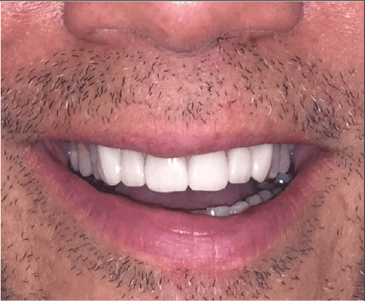 没有一种材料对每种情况都是理想的,因为每种材料都有优缺点。在本病例中,使用两种不同的材料修复了6颗上颌前牙,达到了患者和临床医生满意的笑容修复(图4)。