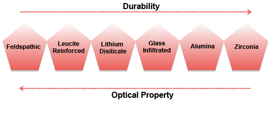 匹配两个具有不同亚结构的中切牙可能是一个挑战。虽然目前市场上已有较好的无金属修复材料,但在某些临床情况下仍需要使用传统的金属烤瓷。在任何情况下,临床医生对材料特性的良好理解,使其能够在期望的情况下有效地选择颜色,以达到可接受的结果。常见的审美材料的总体比较如图5所示。当陶瓷的耐久性向右增加时,其光学性能就会下降,反之亦然。在权衡修复材料的优缺点时,必须考虑所有因素和变量,以实现美学和功能的平衡,并取得整体治疗成功。