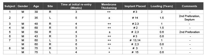 在先前描述的协议后,八名患有12例鼻窦的患者已经治疗了大型穿孔。在重新入口LASFE期间,植入物同时置于所有患者中,代表共15种植入物。愈合膜的临床评估显示出完全闭合,80%的病例中的显着增稠。虽然剩余的20%显示小的不情愿穿孔,但仍然记录膜厚度的增强。在这些病例中成功完成了Lasfe,其中延伸膜升高导致膜的塌陷,从而封闭穿孔(图3)。