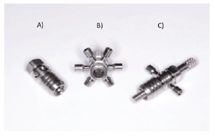 图2:A:外六角种植体改良开放托盘印模无侧位螺钉,B: 6颗侧位螺钉,C: 2颗侧位螺钉用于额外的固位。