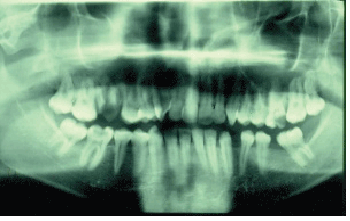 图6:在演示时轨道脓肿案例的Ortho-Pantomo-Graphic X射线视图,请注意右上右磨牙的感染剩余根