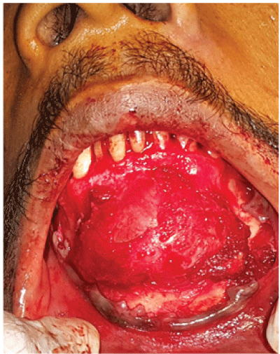 在过去的两周里,一名23岁的男性患者报告了颌骨下部前部的痛苦肿胀。痛苦是连续的,在咀嚼和休息和药物中缓解疼痛。病人注意到两个月后的肿胀,开始作为小肿胀,逐渐生长,以达到当前尺寸(3×4 CMS)。患者患有10年后的创伤和根管治疗牙齿与2年后肿胀的牙齿治疗。在额外的口腔检查上,肿胀的尺寸为3×4厘米,表面正常,具有坚固的一致性,无嘴巴打开限制与可触及的双侧颌下淋巴结。在内部检查患者中,在颌骨对称区域中的肿胀大小为3×4cm,其从33至43个区域延伸到唇肠前庭的局部区域。肿胀表面是正常的,没有任何疤痕和鼻窦。边缘定义很好。在口腔口腔触诊时,肿胀是嫩,坚定的一致性。来自囊肿的吸气透露秸秆色液,蛋白质估计约为10.2g / d1。 The teeth 31,32,33,41,42,43 were non vital.