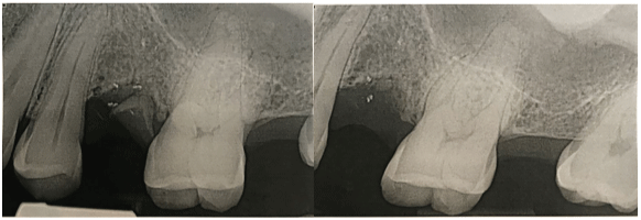 图1:(左)拔牙前和(右)拔牙后保留的13号根尖的根尖周x线片。周围牙槽骨正常的小梁结构。