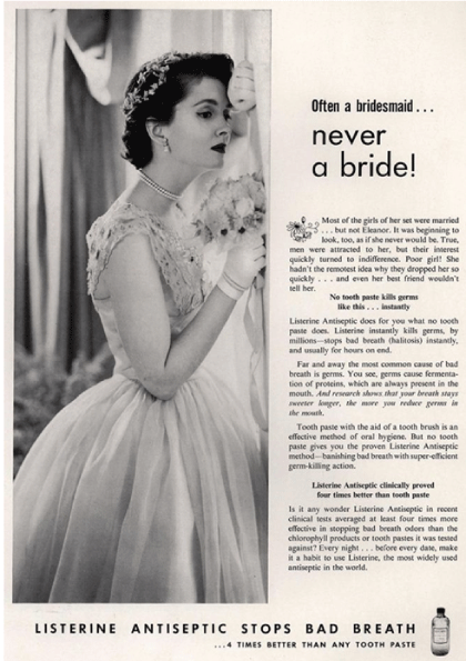 从市场营销的角度来看,这个时机再好不过了,Handwerk指出:“美国公众对‘细菌’的恐惧比以往任何时候都多,这有助于一次性纸杯和Kleenex®[39]的成功。”没过多久,全美国的人都患上了口臭,现在多亏了兰伯特制药公司和李斯德林,这种由“细菌”引起的可怕疾病才得以治愈。