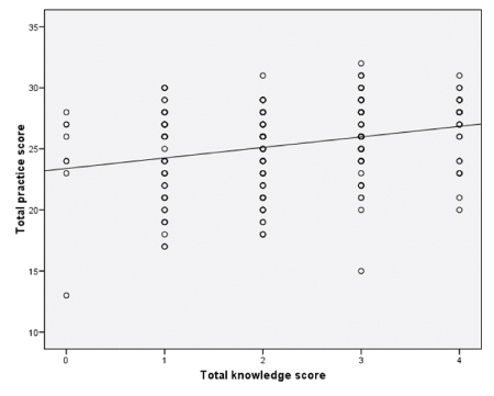 简单线性回归显示感染控制知识得分与正确做法之间存在显著相关(p<0.001, r²= 0.072),见图2。然而,感染控制态度得分与正确行为之间无显著相关(p=0.257)。