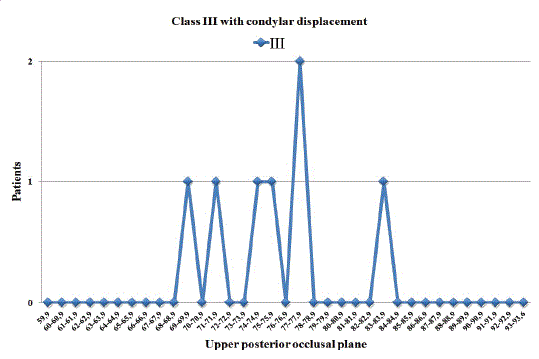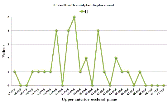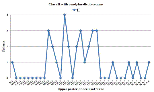 大多数I类和髁状突移位患者的上后咬合平面角度值接近76-77度。大多数II类和髁状突移位患者的上后咬合平面角度值在67-81度之间。III类患者的上后咬合平面角度值分别约为77度。