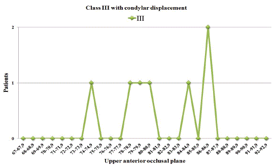 如果我们参考上前咬合平面角度,大多数I类患者和髁突移位显示值在76和81度之间。大多数II类和髁突移位患者的角度相同,均为77度。在第三类中,这个角分别是86度。