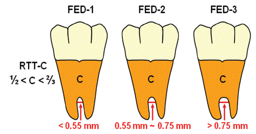 根据分叉入口尺寸和新超声探头的平均直径(0.55 mm)以及FED-1(小于0.55 mm)时新刮匙的最窄刀片宽度(0.75 mm),显示磨牙根分叉上的三种RTT-A地形图;美联储-2;(0.55-0.75毫米);和FED-3(>0.75mm)。