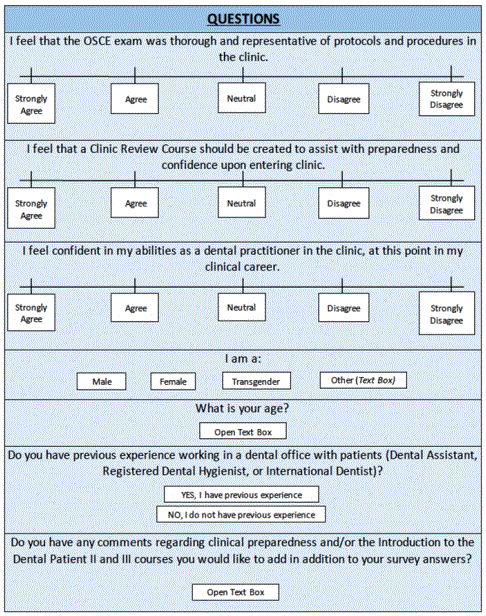 我们的调查问卷由14个问题组成,使用五点李克特量表(强烈同意、同意、中立、不同意、强烈不同意)除非另有说明。问题询问学生IDP II和III课程是否有助于融入临床,讲座是否类似于学生在临床中处理程序。他们询问讲座是否详细,内容丰富,适用于考试、牙科手术、牙周病学、口腔修复学。此外,是否学生需要更多关于临床特定协议的讲座,如Axium电子记录、治疗计划、程序分阶段,或完成口腔病理学或医学咨询?临床教学大纲或临床回顾课程是否有助于帮助学生做好进入临床的准备和信心ere询问是否客观结构化临床检查(OSCE)在进入诊所之前进行的管理是彻底的,并且代表了诊所的协议和程序,如果学生对他们作为诊所牙科医生的能力有信心,那么在他们的临床职业生涯的这一点上。学生们被问到在进入诊所的什么时候他们觉得准备好治疗患者,im在2周、1个月、3个月或6个月内,以及学生人口统计数据。在将问卷发送给195名TUSDM牙科三年级学生后,我们留出6周时间进行回复,在截止日期前两周发送一封提醒电子邮件。