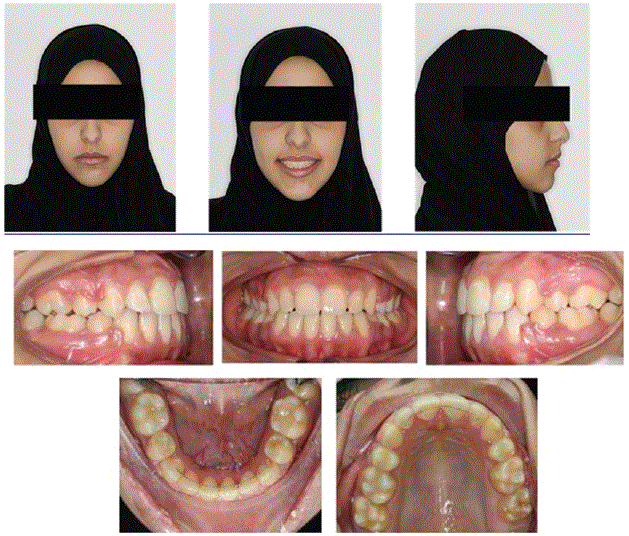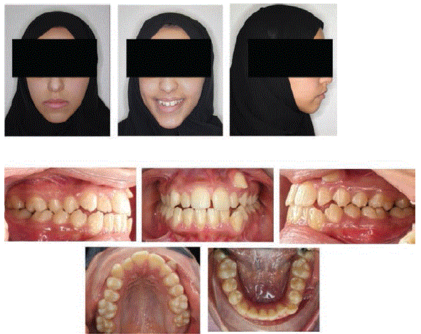 一位17岁的女性患者就诊于正畸诊所,主诉上颌弓严重拥挤。她表现出凸的轮廓,钝的鼻唇角,由于下颌向右偏移而导致的不对称面部,以及相对于面部中线(FML)的上中线向左偏移。