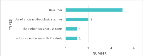 从这个意义上说,考虑到表达研究类型的研究(53篇中的52篇),30.77%的研究引用了Hernández R, et al.,其次是Hurtado J, 17.31%的研究引用了Hurtado J, 15.38%的研究没有具体说明作者[23,24]。Hurtado J等人的标准在7.69%的病例中被误用,Hernández R等人的误用率为3.85%。在描述这类研究的方法论作者时,可能存在的缺陷总数达到了42.31%(图9)[23,24]。