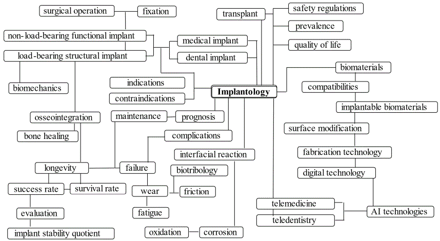 缺牙会损害口腔健康、生物功能和美观。自20世纪50年代以来,植牙治疗已经成为牙齿置换的黄金标准。在美国,有数百万人经历过某种程度的牙齿脱落;事实上,超过3000万人的上颌骨和下颌骨的牙齿都不见了。据报道,年龄在35 - 44岁之间的成年人中,69%的人因为事故、牙龈疾病、根管失败或蛀牙而至少掉了一颗恒牙[2,3]。此外,到74岁时,26%的成年人失去了所有的恒牙。因此,每年大约放置10 -30万颗牙科种植体,这接近每年人工全髋关节和全膝关节置换的数量[5]。可见,适当的种植治疗可提高患者的口腔健康相关生活质量。即使大家都知道,根据大量的临床研究,种植体的成功率为95 - 98%,种植体治疗的成功还需要多种重要因素的支持,包括生物相容性、生物力学相容性、表面特性、种植体设计和表面改性、病人的健康状况和骨质量,以及手术技术。 All are, to different extents, related to an osseointegration. Figure 1 illustrates how all these factors are directly or indirectly related to each other to improve the quality of procedures, outcomes and prognosis of the implant treatment [6].