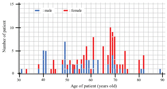 如图2所示,总共127例(包括第一部分的35例和第二部分的40例)按年龄和性别列出,其中有54名男性患者和73名女性患者。根据年龄分布,我们将植入患者分为两组:65岁以下(总共69名患者=41名男性+28名女性)65岁以上(共58名患者=13名男性+45名女性)。将65岁分为两个年龄组的原因是,65岁是进入老龄化社会的普遍接受的“年龄标准”之一。在这项研究中,发现年轻植入患者多于老年患者,尽管差异不显著。就性别而言,女性患者在年轻组中,ts似乎比男性患者少;而在老年组中,女性患者占主导地位,这可能是由于(i)女性的预期寿命比男性长十年和(ii)美学原因。