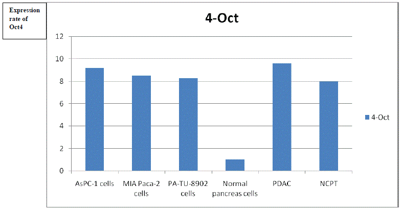 目的基因(Oct4)在PDAC和NCPT、MIA Paca-2、PA-TU-8902、aspc -1细胞株中的表达率与对照组(正常)比较见表2、表1。