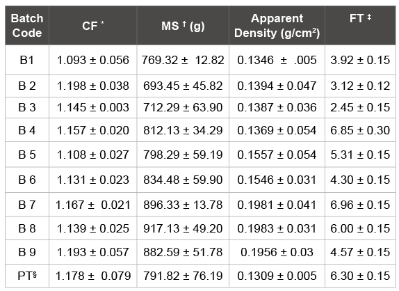表1:不同批次及其组成(因子水平)、产率和包封效率