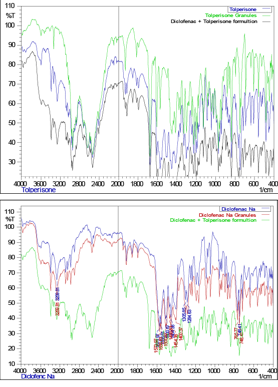 使用岛津FTIR光谱仪(8400 S)记录FTIR扫描,使用KBr作为阴性对照(空白)。然后在400-4000 cm的扫描范围内分析样品-1使用傅里叶变换红外光谱法研究了盐酸托培松和双氯芬酸钠与所用聚合物的相互作用。使用KBr混合法使用FT-IR仪器测量了纯药物和制剂的FTIR光谱。发现混合物的FTIR光谱中的这些主峰没有变化f药物和聚合物。因此,如图1和表4和表5所示,药物与聚合物没有任何相互作用。