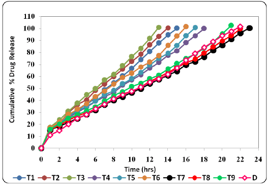 从配方的容重值可以看出,该配方具有良好的包装特性。各剂型(T1-T9, D)的体积密度和抽头密度分别为0.360 ~ 0.464g/ml和0.413 ~ 0.528 g/ml。静止角在26°范围内观察到。80΄29°.57΄。Carr’s指数在9.70% ~ 13.33%之间变化,说明该颗粒共混物对所有配方均具有良好的流动性和良好的压缩性,豪斯纳比在1.10 ~ 1.15之间(表6)。结果表明,各参数均在一定范围内。