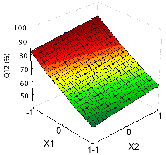使用statistica软件版本8.5生成响应面图(盐酸托培松层),以观察自变量对所研究响应的影响,如t50T90问1Q12Q18Q22,和n。响应曲面图显示,自变量的不同组合Methocel K100 M (X1)和乳糖(X2)可满足任何特定要求,同时考虑剂型中涉及的各种因素(图3至图9)。