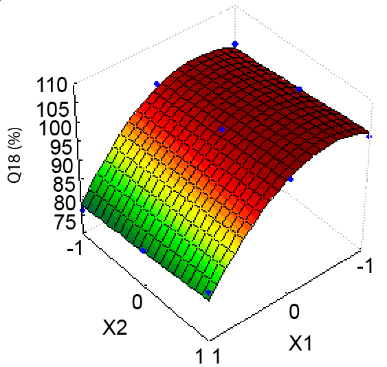 Q18 = 10.41 - 10.366 (x1x2) - 10.446 (x1X1) + 0.133 (2X2) + 1.59 (X1X2)